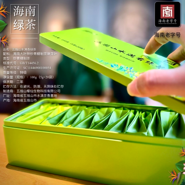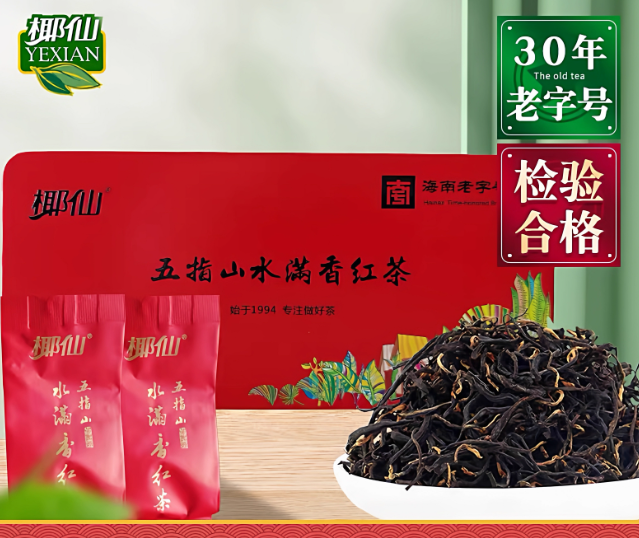 ¥128元/ 盒。五指山水满香红茶100g 精品盒装 海南椰仙特级大叶工夫红茶奶蜜香,5g*20包/盒!