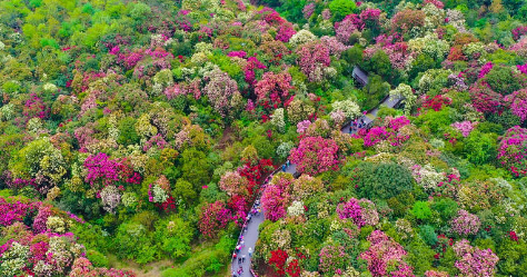 百里杜鹃,因其原始林带宽1~3千米,绵延50余千米得名,是国家级森林公园,2013年成功晋升为5A级景区。初步查明公园内有马缨杜鹃、露珠杜鹃、团花杜鹃等41个品种,囊括了世界杜鹃花5个亚属的全部。这里被誉为“世界上最大的天然花园”,享有“地球彩带、世界花园”之美誉。暮春3月下旬至5月各种杜鹃花竞相怒放,漫山遍野,千姿百态,铺山盖岭,五彩缤纷。