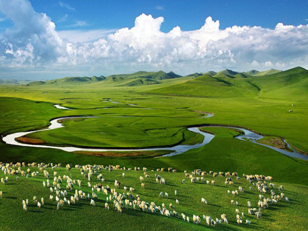“天下第一曲水”的莫尔格勒河畔就蜿蜒盘踞在这片草原。河水静静流淌,时而湍急时而安静、河流也深浅不一,河岸旁是低头吃草的牛羊。上到河畔的至高点,俯瞰莫尔格勒河畔的美丽景色:蓝天白云映衬下的草原,点缀着河流两旁吃草的牛羊。这片景象真的美极了。