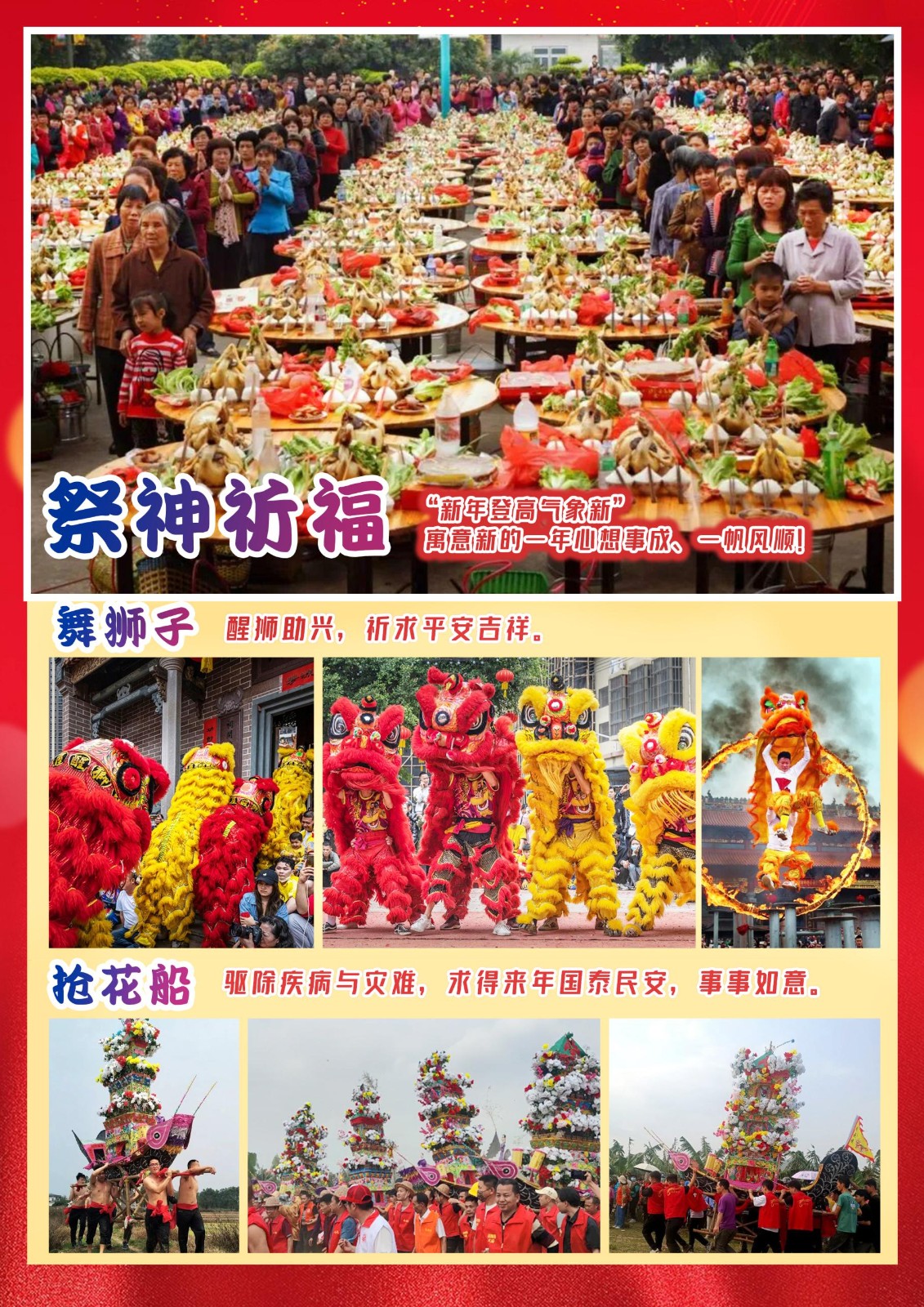 年例文化源远流长,有历史,乏记载。所谓年例,即"溯古例今、年年有例"是指每年定期举办的群体大型祭祀活动。年例礼俗以敬神、游神、摆盅台(做酿亦称摆酿)祭礼为核心,并伴以各种民俗文化表演节目和宴请亲朋好友,而开展的群体祭祀活动;主旨是酬谢天地神祖恩德,驱邪祛疫,祈祷风调雨顺、百业兴旺、国泰民安。 “借得西湖水一圜,更移阳朔七堆山”,肇庆七星岩真的太美啦!这里有七座翠峰如北斗散落湖面,湖光山色,宛如人间仙境 。 Day1:始发地--湛江--迈合村--金沙湾--赤坎老街 餐饮:含中餐 住宿:湛江市区 约定时间地点集合, 乘船前往湛江市区,前往打卡奥运跳水冠军-全红婵的老家-麻章迈合村;这座诞生奥运冠军的小村,已在村口立下了奥运五环新标识。拐进村子,两棵高大的凤凰树映入眼帘,这就是婵宝家门口的“水花消失树”。不少慕名而来的游客纷纷在树前打卡留念,空气中弥漫着喜悦和骄傲的气息。 午餐后前往游览唯美浪漫的 【金沙湾海岸】(游览时间30分钟) 碧海椰风令人心旷神怡漫步海滩感受半岛海岸生活,观中国奥运跳水冠军湛江选手运动女神---【劳丽诗雕像广场】。那里椰树成林,绿草如茵,沙滩洁白如雪,走在边上,海风轻拂,让你忘却都市的喧闹,尽享这一刻的宁静。后于市区游览民心工程,长达4.8公里,具有南国风光、热带景致的城市海滨绿化观光带观海长廊; 打卡《隐秘的角落》取景地-【赤坎老街】,赤坎老街是广东省湛江市历史最悠久的地域,也曾经是湛江商贸最发达的地域之一。赤坎区原是只是个海边的古商小埠,早在宋代就已成雏形。自从清康熙年解间除长达200余年的海禁后,海运商贸迅速发展。因为这里曾经是法国的殖民地,所以建筑受到法国影响较大。骑楼建筑群曾经是广州湾时代辉煌一时的商业街;显示出海港城市的商业传统。旧的风情老街、民居旧宅,对研究赤坎区历史进程、商贸发展、风土人情、民俗文化极具史料价值,也是城市不可多得的文化资源; 后前往【中澳友谊花园】,它是广东省湛江市与澳大利亚凯恩斯市友好情谊的象征。花园规划分为三个景观区,并以水体贯穿,充分体现澳洲风情和中国南方海滨城市风光特色。园内有 20 多种 400 多株澳洲特色植物,还种植了凯恩斯市捐赠的火焰树、金花树和湛江市的市花紫荆花。主要景点有澳洲园、红林大道、灯塔广场、滨湖木栈道、品果轩、雨林植物观赏区等,园内雕塑、园林小品、园林铺设及建筑风格突出了澳洲土著文化特色和湛江本土文化特色。晚餐后前往入住酒店。 Day2:湛江-年例-肇庆-宋城墙-宋城骑楼街 餐饮:含早中晚餐 住宿:肇庆 早餐后前往【过年例的村子】与当地村民一起热热闹闹过年例, 跟随导游前往体验各种年例活动, 年例当天, 在湛江农村家家户户张灯结彩, 村镇街道布置彩楼、彩廊、画廊等, 路旁插满彩旗, 鞭炮霹雳、锣鼓咚咚此起彼伏, 醒狮班前来舞狮助兴, 各种民间艺术表演竭尽所能, 观者络绎不绝。 村子里家家户户张灯结彩,村镇街道布置彩楼、彩廊、画廊等,路旁插满彩旗, 鞭炮霹雳、锣鼓咚咚此起彼伏, 滚刺床、穿令箭、舞鹰哥、雷剧、飘色、醒狮、等节目及八方 亲朋齐助兴,让您大饱眼福! 注:年例是当地村民自发组织发起,如遇不可抗力原因或村里原因取消,我社不属违约! 后前往游览肇庆【宋城墙】----全长周长2800米。史料记载,肇庆始为土城墙,宋政和三年(1113年)将土城扩大,并筑为砖城。宋代始建的城墙至今仍然保存完整,被专家称为是“广东第一、全国罕见"的砖的博物馆。 后前往【宋城骑楼街】是以复古,非遗为核心元素,聚焦博物馆、非遗传承、旅游、手信、美食、艺术等内容打造集历史、文化、休闲、娱乐于一体的肇庆旅游“新名片”。充满民国风情特色的招牌高高悬挂,霓虹灯等装饰古色古香,历史气息与现代潮流交融,令人眼前一亮。晚餐后前往入住酒店。 Day3:鼎湖山-七星岩-肇庆 餐饮:含早中晚餐 住宿:肇庆 早餐后前往【鼎湖山](含大门票,景区内环保车自理,30元/人)一-“北回归线上的绿洲”一鼎湖山地处北纬23 度10分,位于北回归线附近。在世界上,北回归线穿过的许多地方都 是荒凉的大沙漠,但在鼎湖山却截然相反,这里雨水充沛,山青水秀,林木茂盛,形成了一片有4000公顷的原始及原始次森林。【宝鼎园]内观世界最大的天湖九龙宝鼎(16吨青铜鼎,高6。68米)、在这里负离子含量极高,每立方厘米最高含理达1005600个,在这里天然氧吧让你尽舒胸怀!! 后前往国家AAAAA级风景名胜【七星岩风景区】(含大门票,景区内电瓶车自理,30元/人)七星岩位于肇庆市区北约4公里处,景区由五湖、六岗、七岩、八洞组成,面积8.23平方公里,湖中有山,山中有洞,洞中有河,景在城中不见城,美如人间仙境。七星岩以喀斯特溶岩地貌的岩峰、湖泊景观为主要特色,七座排列如北斗七星巧布在面积达6.3平方公里的湖面上,所以取名为七星岩。20余公里长的湖堤把湖面分割成五大湖(碧莲湖、红莲湖、中心湖、仙女湖、波海湖),风光旖旎。被誉为"人间仙境"、"岭南第一奇观"。 后参观位于七星岩景区外围的【紫荆西堤文创街]紫荆西堤就是以肇庆紫荆花为主题设计的一条文创街,是一条集餐饮、休闲娱乐和文化体验于一体的网红夜市街,南北向全长约700米。在紫荆花盛开时节,西堤旁粉红的花朵沿着蜿蜒的湖边一路蔓延,形成了一道浪漫唯